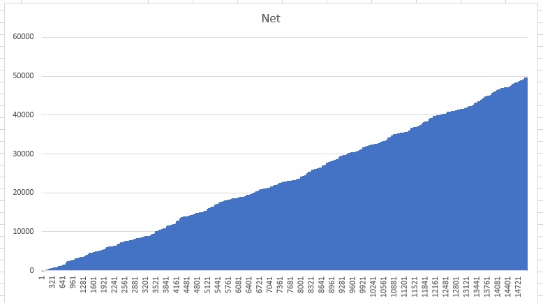 And in order to win 50K by the end of 15,000 spins, you won't be reluctant to place a $256 bet at a certain level of the system usage, which is the worst case scenario and the run will end nevertheless with a profit.